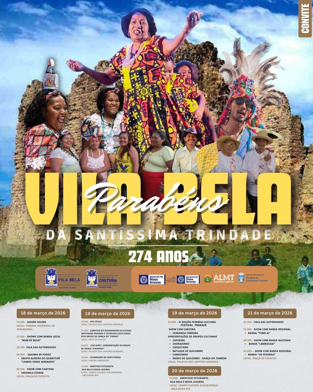 🎉 Venha celebrar conosco os 274 anos de Vila Bela da Santíssima Trindade! Nossa Primeira Capital de MT, berço da História e Cultura de MT. Nosso Orgulho!!!