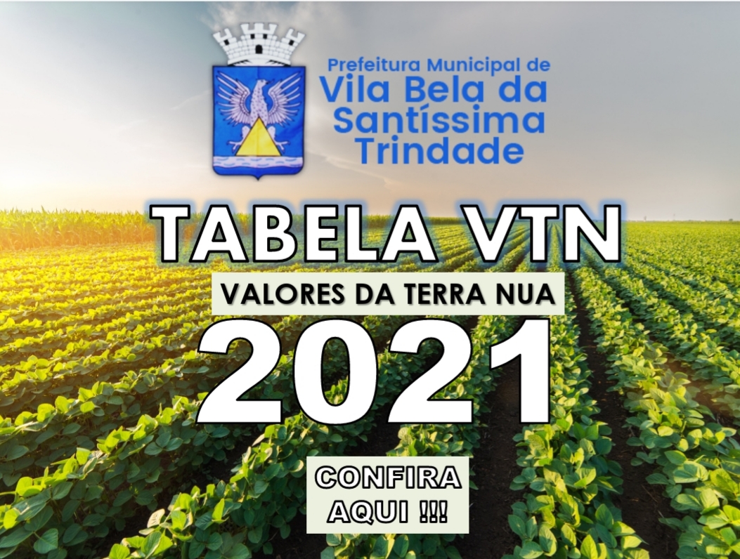A Prefeitura Municipal, em cumprimento ao disposto na Instrução Normativa RFB nº 1562, de 15 de abril de 2015, informa a tabela de valores atualizados referentes ao VTN – Valor da Terra Nua do Município de Vila Bela da Santíssima Trindade para o ano de 2021, conforme a tabela do Ofício nº 0453/2021 de Vila Bela da Santíssima Trindade.
